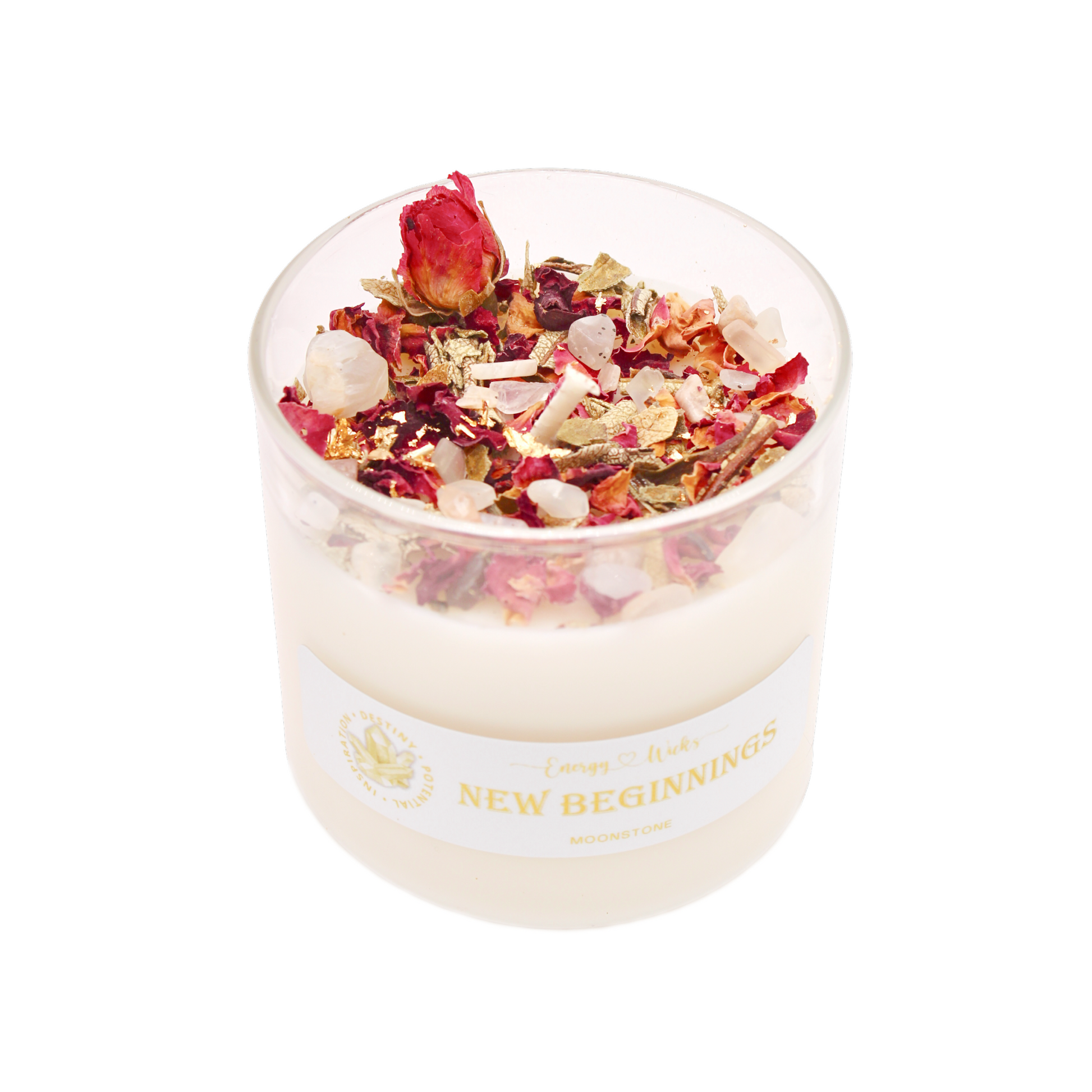 Experience the power of our New Beginnings Crystal Candle as it promotes inspiration and success. Moonstone is renowned for its capacity to enhance intuition, spirituality and communication, allowing for the dissipation of any energy blocks that may have been impeding progress and helping to uncover your true path.